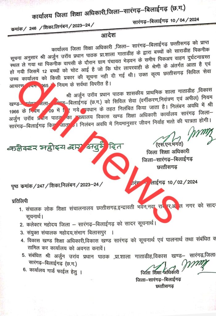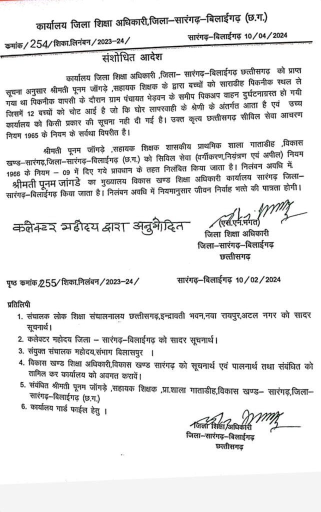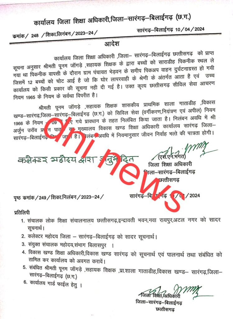 सारंगढ़|| विकासखंड के गाताडीह स्कूल से पिकनिक पार्टी करने गए बच्चो को पिकप वाहन वापसी आने के दौरान लापरवाही पूर्वक वाहन चलाने के वजह से स्कूली बच्चो से भरी पिकप जा पलटी थी जिस संबंध में दर्जनों बच्चे घायल हुए है जिस संबंध में DNI NEWS कि टीम ने तत्काल समाचार प्रकाशित किया जहा ज़िला शिक्षा अधिकारी ने पत्र भेजा जिसमे कलेक्टर साहब ने तत्काल अनुमोदन कर प्रधान पाठक श्री अर्जुन उरांव और सहायक शिक्षिका पूनम जांगड़े को तत्काल प्रभाव से सस्पेंड कर दिया है। यह शिक्षा विभाग को लेकर गहरी लचर रवईया है ऐसे शिक्षक सस्पेंड नही बल्कि बर्खास्त होने की करवाही होनी चाहिए :विनीत पीड़ित पालक जिसकी वीडियो @dni news YouTube पर अपलोड है।