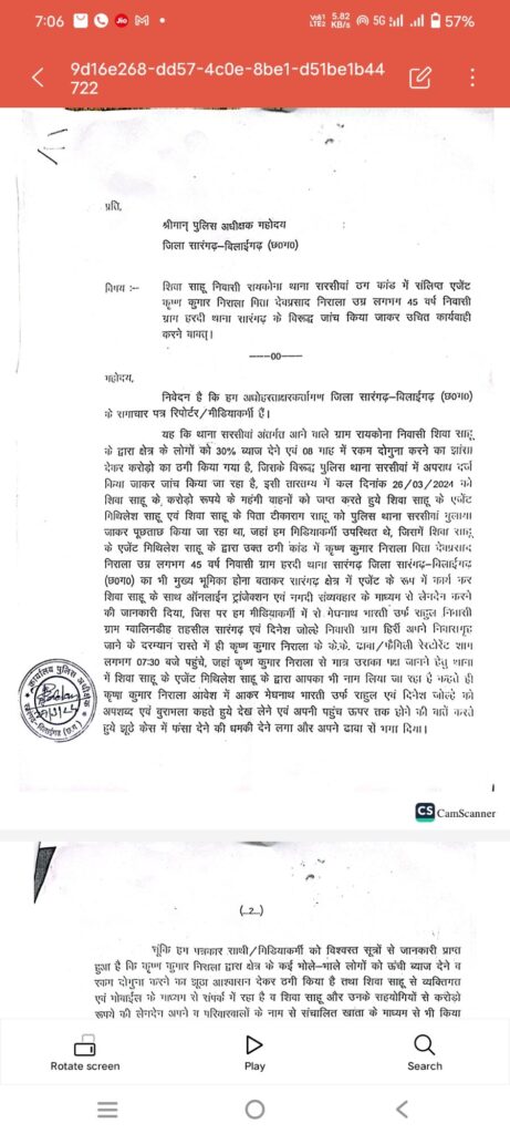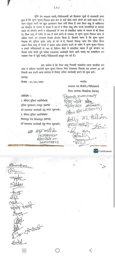 सारंगढ़ के हरदी निवासी तथा के.के.ढ़ाबा के संचालक कृष्ण कुमार निराला के तार महाठग शिवा साहू से जुड़े होने का संदेह व्यक्त करते हुए पत्रकारो ने आज पुलिस कप्तान पुष्कर शर्मा से मुलाकात किया तथा इस संबंध में जांच एवं दोषी पाये जाने पर कड़ी कार्यवाही संबंधी ज्ञापन सौपा। बताया जा रहा है कि शिवा शाहू के कथित एजेंट मिथिलेश साहू के द्वारा उक्त ठगी कांड में कृष्ण कुमार निराला पिता देवप्रसाद निराला उम्र लगभग 45 वर्ष निवासी ग्राम हरदी थाना सारंगढ़ जिला सारंगढ़-बिलाईगढ़ (छ०ग०) का भी मुख्य भूमिका होना बताकर सारंगढ़ क्षेत्र में एजेंट के रूप में कार्य कर शिवा साहू के साथ ऑनलाईन ट्रांजेक्शन एवं नगदी संव्यवहार के माध्यम से लेनदेन करने की जानकारी दिया, जिस पर सारंगढ़ के मीडियाकर्मी में मेघनाथ भारती उर्फ राहुल निवासी ग्राम ग्वालिनडीह तहसील सारंगढ़ एवं दिनेश जोल्हे निवासी ग्राम हिरीं अपने निवासगृह जाने के दरम्यान रास्ते में ही कृष्ण कुमार निराला के के.के. ढाबा/फैमिली रेस्टोरेंट शाम लगभग 07:30 बजे पहुंचे, जहां कृष्ण कुमार निराला से उनका भी पक्ष जानने हेतु सवाल किये जिससे कृष्णा कुमार निराला आवेश में आकर मेघनाथ भारती उर्फ राहुल एवं दिनेश जोल्हे को अपशब्द एवं बुराभला कहते हुये देख लेने एवं अपनी पहुंच ऊपर तक होने की बातें करते हुये झूठे केस में फंसा देने की धमकी देने लगा। जबकि पत्रकारों ने कृष्णा का पक्ष जानने के लिए कई दफा दूरभाष के माध्यम से संपर्क भी किया गया लेकिन वर्जन नही मिल पाया। वही पत्रकारो ने पुलिस कप्तान को बताया कि विश्वस्त सूत्रों से जानकारी प्राप्त हुआ है कि कृष्ण कुमार निराला द्वारा क्षेत्र के कई भोले-भाले लोगों को ऊंची ब्याज देने व रकम दोगुना करने का झूठा आश्वासन देकर ठगी किया है तथा शिवा साहू से व्यक्तिगत्त एवं मोवाईल के माध्यम से संपर्क में रहा है व शिवा साहू और उनके सहयोगियों से करोड़ो रूपये की लेनदेन अपने व परिवारवालों के नाम से संचालित खाता के माध्यम से भी किया है। शिवा साहू को एजेंट के रूप में कार्य करने के पश्चात् से कृष्ण कुमार निराला आय से अधिक रूपये का एकाएक बेनामी लेनदेन किया है, जिससे स्पष्ट है कि कृष्ण कुमार निराला की भूमिका पूर्णतः संदेह के घेरे में है, जिसके विरुद्ध जांच टीम गठित किया जाकर शिवा साहू के संपर्क में रहकर अवैध लेनदेन करने के संबंध में कृष्ण कुमार निराला व उनके परिवारवालों के नाम से विभिन्न बैंको में संचालित खाता में हुये लेनदेन का निष्पक्ष जांच करते हुये उचित दण्डात्मक कार्यवाही किया जाये।