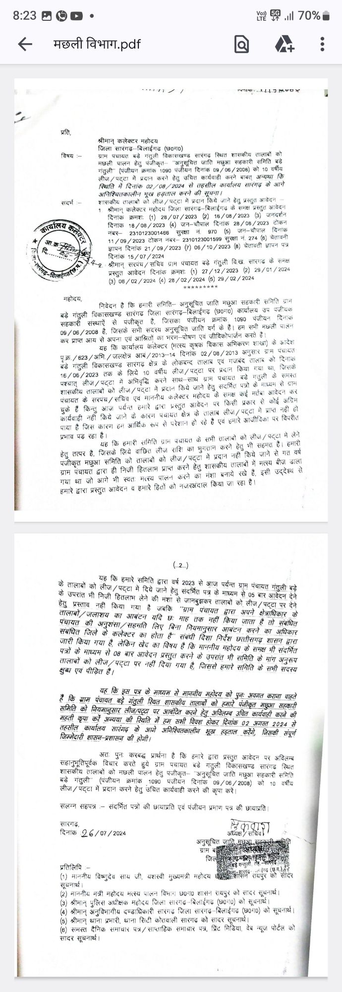 सारंगढ़। छत्तीसगढ़ सरकार हर वर्ग को आत्मनिर्भर बनाने के दावे कर रही है, जिसमे सबसे ज्यादा समूह,समिति को आगे लाने कि लाख दावे है मगर यह दावे को सारंगढ़ आने के बाद खोखले व बौने साबित होते देखा जा रहा है इसका ताजा उदाहरण है ग्राम बड़े गंतुली के मछुआरा समिति जिसकी पंजीयन लगभग 20 वर्ष पुरानी है वही इस समूह ने सरकार की प्रत्येक स्वालंभी योजना को विधि अनुरूप क्रियावन्यन करने की हर एक संभव प्रयास किया है लेकिन इस अनुसूचित जाति मछुआ सहकारी समिति बड़े गंतुली पूर्व में दर्जनों वर्षो तक मछली पालन कर आत्मनिर्भर बन अपने परिवार की पालन पोषण की जिम्मेदारी भली भांति निर्वाहन कर रहे थे लेकिन अब वही परिवार बेरोजगार हो गए है जबकि उस तालाब में दबंग व्यक्ति अपना लिज़ बनवाने के लिए जुगाड में लगे हुए है ऐसे जानकारी सूत्रों से प्राप्त हो रहे है। वही सरकार की पहली प्राथमिकता दर्जनों वर्ष पुरानी समूह को देना है यह मछुआ समिति विगत 16 वर्षो से निरंतर सरकार की प्रत्येक शर्ते निर्देशों के अनुरूप काम कर मत्स्य पालन करते आ रहे थे। लेकिन अब ग्राम पंचायत की दबंग रसूख दार की आंख उस तालाब में पढ़ गया और गरीबों की पेट पर लात मारने का काम कर रहा है। लिहाजा गरीब व्यक्तियो का एक मत्स्य खेट करने का समूह को सरकार ने ही पंजीयन कर समिति बनाया है लेकिन अब उसको मत्स्य पालन करने की जिम्मेदारी नहीं मिल रही तो इनके परिवार अब बिखर कर अन्यंत्र प्रदेश पलायन कर रोजी मजदूरी करने के लिए विवश दिखाई दे रहे है। वही बहुतों पंचायत में मछली पालन के लिए जिम्मेदारी सरकार ने निभाया है। लेकिन इस समूह को सरकार आश्वासन देने के बाद भूल गया आखिर वजह समझ से परे हो जा रहा है। अगर त्वरित करवाही कर मत्स्य खेट हेतु पट्टा नहीं दिया गया तो ग्रामीण समूह आंदोलन कर प्रदर्शन करने के लिए कलेक्टर दफ्तर में ज्ञापन दिया है।