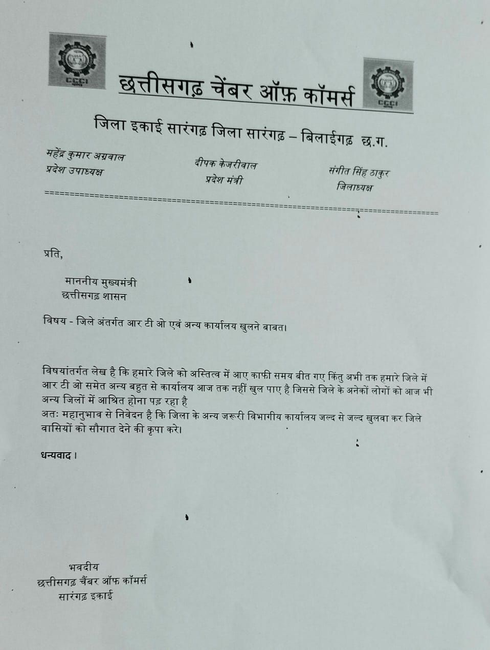 सारंगढ़: सारंगढ़ बिलाईगढ़ जिले का गठन हुआ कई वर्षों बीत गया लेकिन अभी तक बहुत सारे कार्यालय का काम काज अन्यत्र जिला से करवाना पड़ रहा है जिसमें नवीन जिले बनने के बावजूद भी दूसरे जिले से काम काज करवाने के लिए भाग दौड़ करना पड़ रहा है। जिसको संज्ञान लेते हुए छत्तीसगढ़ चैंबर ऑफ़ कॉमर्स के जिला इकाई सारंगढ़ बिलाईगढ़ अध्यक्ष संगीत सिंह ठाकुर ने मुख्यमंत्री विष्णु देव साय को ज्ञापन सौंपा है।