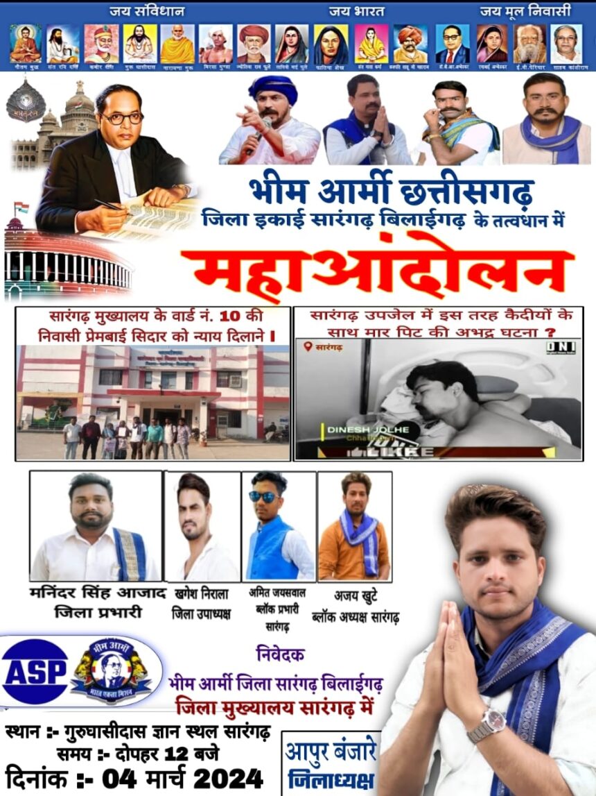 (1) प्रेम बाई सिदार जी को उनके भूमि का पट्टा दिलवाने की जायज मांग को लेकर भीम आर्मी छत्तीसगढ़ जिला इकाई सारंगढ़ बिलाईगढ़ के तत्वावधान में दिनांक 4 मार्च 2024…